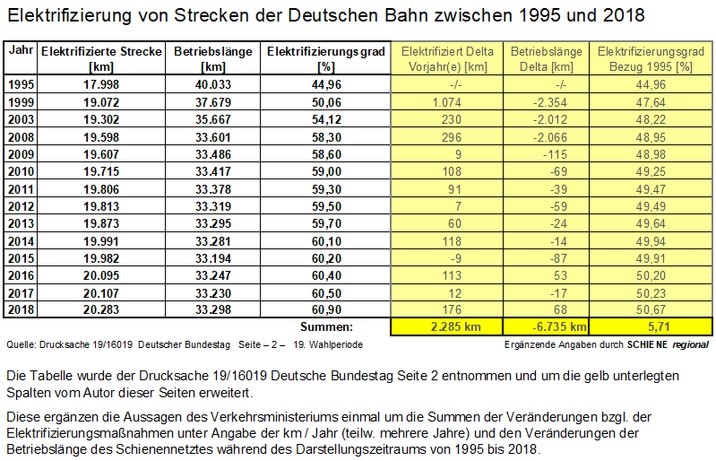 Daher wird in der Tabellenergänzung zusätzlich der Elektrifizierungsgrad, bezogen auf das Ausgangsjahr 1995, angegeben.